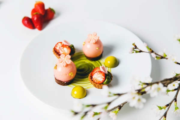 ペストリーシェフのジェニー・チュウが桜シーズンの3、4月にご提案するのは、紅く染まるいちごと花がほころぶ桜を表現した春のこの時期にふさわしいアフタヌーンティー。