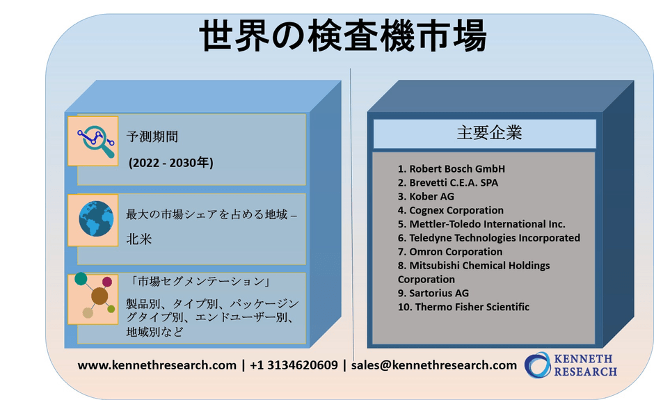 リサーチ・ネスターの一部門であるケネス・リサーチは、2021年12月10日に世界の検査機械市場の予測評価を提供する調査レポートを最近発表しました。世界の検査機械市場における成長ドライバー、市場機会、課題、脅威など、いくつかの主要な市場ダイナミクスを強調しています。