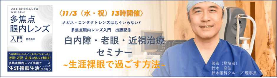【セミナー申し込み受付中】『白内障・老眼・近視治療セミナー~生涯裸眼で過ごす方法~』11月3日(水・祝)開催