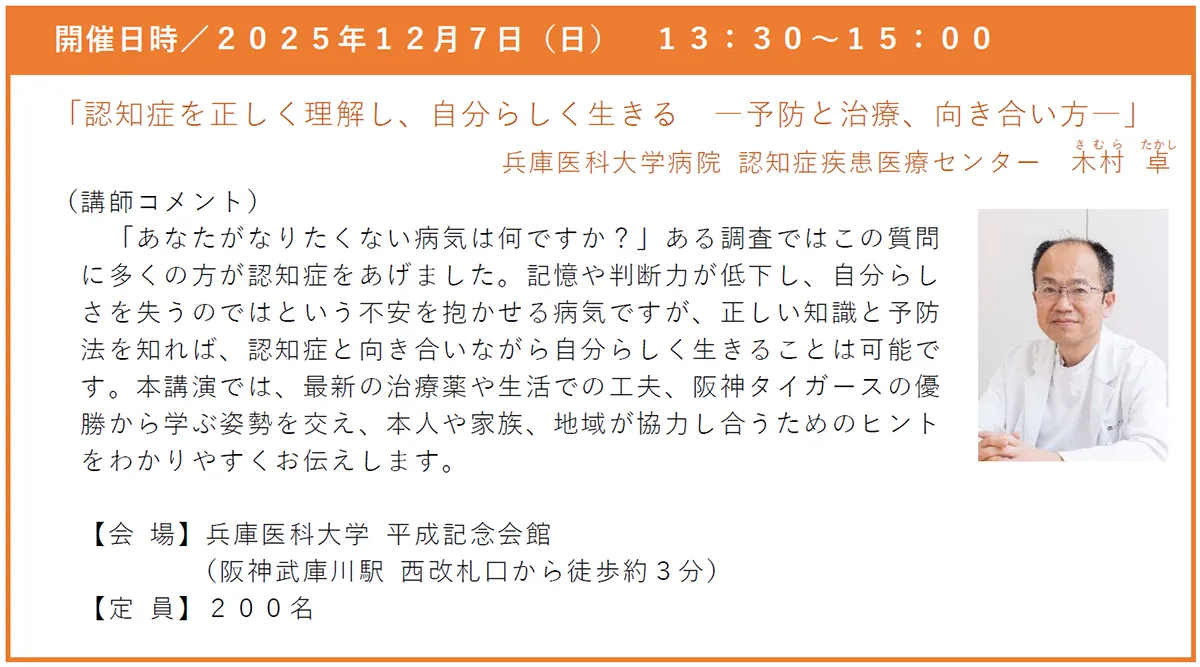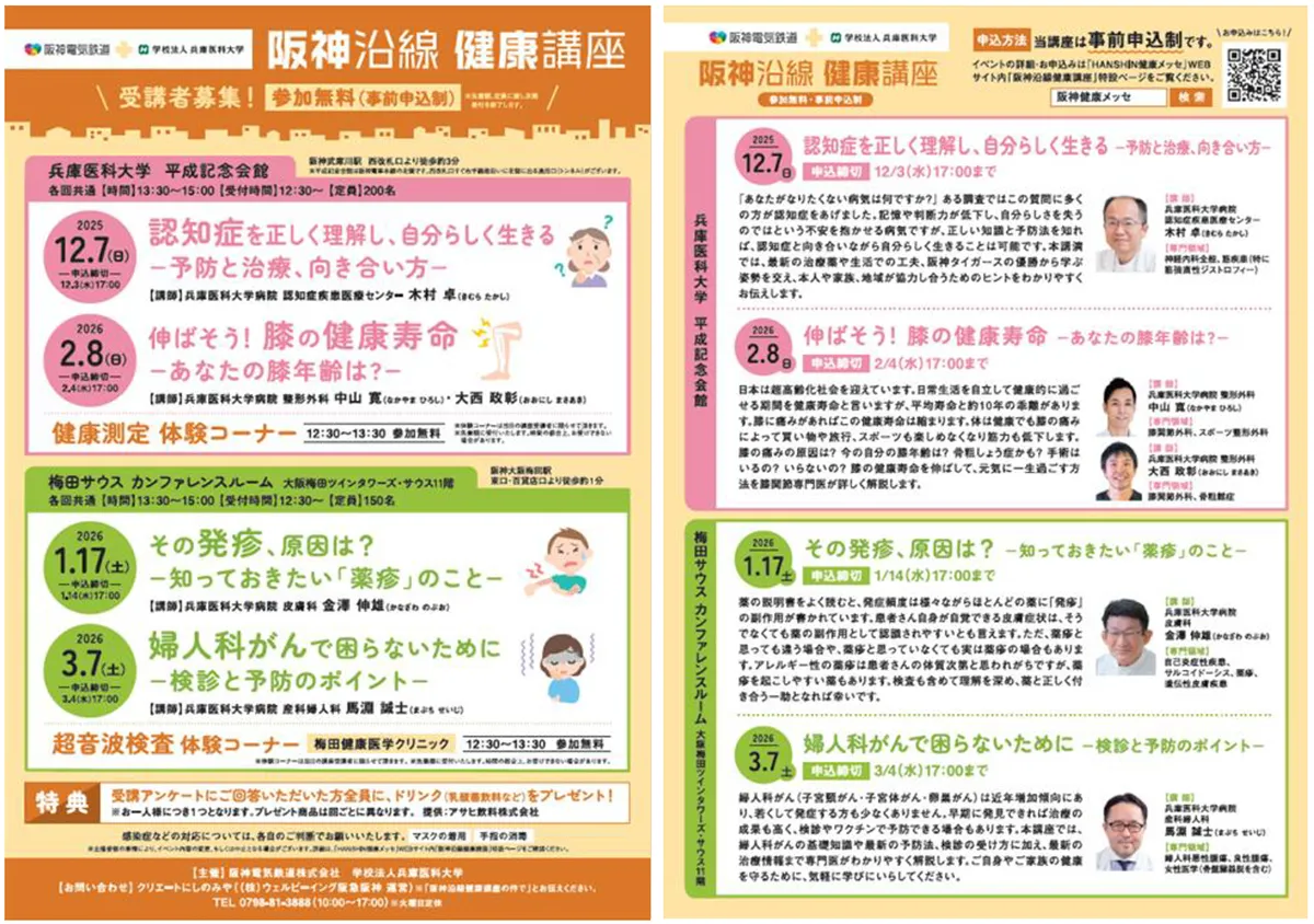 ~認知症・発疹・膝の痛み・婦人がん~ 兵庫医科大学病院の医師による 「阪神沿線 健康講座」を12~3月に開催!