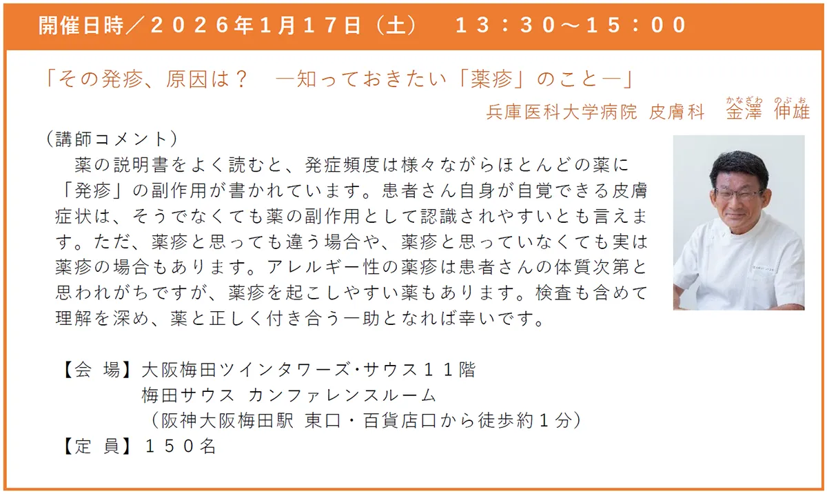 【1月17日(土)】その発疹、原因は?―知っておきたい「薬疹」のこと―