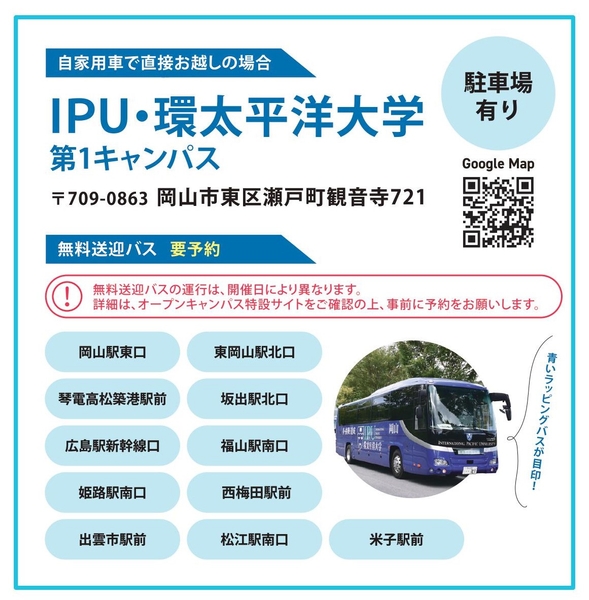 IPU・環太平洋大学(岡山県岡山市東区瀬戸町)は、5月12日(日)に『4年後の自分に会いに行こう!』というテーマでオープンキャンパスを開催します。豊富なプログラム(全体、学科、入試、保護者、就職等ガイダンス、キャンパス・寮見学ツアー)、体験イベント、個別相談会のほかに、入試特典やプレゼントをご用意していますので、ぜひご参加ください。お申込みは次のリンクからお願いします。https://ipu-japan.ac.jp/news/23139/