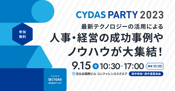 働き方の多様化、人的資本開示への対応など、人事・経営のトレンドは大きく変化しています。「CYDAS PARTY 2023」は、これからの人事と経営が知っておくべきことが1日で学べる人事と経営の未来を考える参加費無料(事前予約制)のオフラインイベントです。