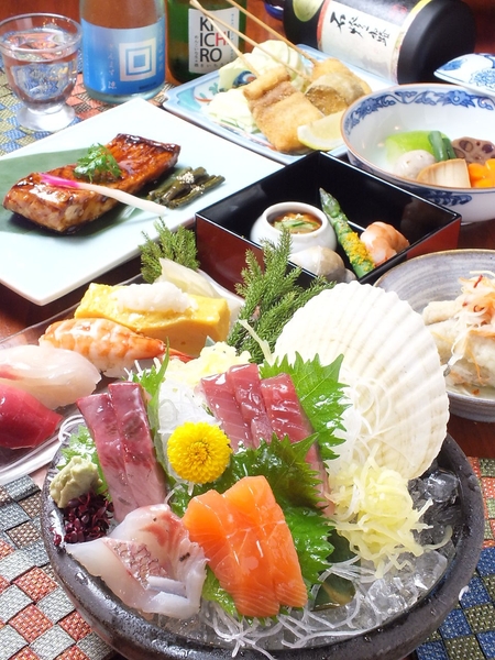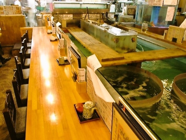 1996年のオープン以来、店内中央には大きないけすを配置し、カウンター席もあるためおひとり様でも気兼ねなく利用できます。小上がりのお座敷は広々としており、最大100名ほどを収容可能。仕切りで個室にもできるため、少人数での食事会から忘新年会、歓送迎会など様々なシーンに対応します。