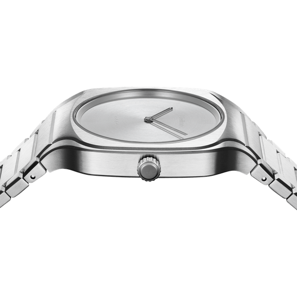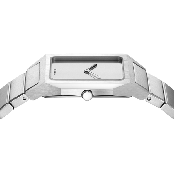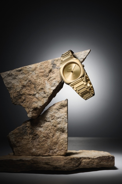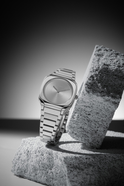 「AURA」は、D1 MILANO初となる長方形ケースを採用し、クラシックなフォルムにモダンな輝きを融合させたコレクションです。ヴィンテージ感あふれるシルエットに、サテン仕上げのステンレススチールケースを組み合わせ、エッジにはポリッシュ仕上げのファセットを施すことで、光を美しく反射するデザインに仕上げました。