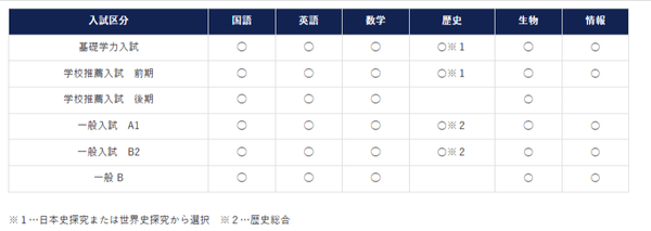岡山県内大学で初導入となる「情報」が、科目試験型入試に新設されます。また、昨年は歴史総合のみだった「地歴」科目に、「日本史探究」と「世界史探究」が新設。入試区分ごとに、最大文系4科目、理系3科目の計7科目から選択可能となりました。