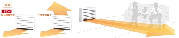1. 遠くの足元まで温風を直接届けて暖める、床置形エアコンならではの「足元暖房気流」を搭載