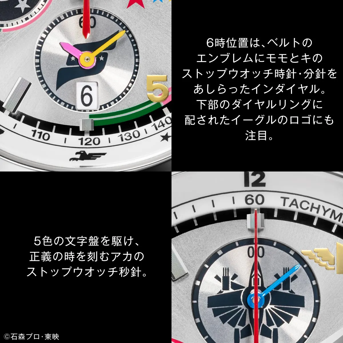 6時位置は、ベルトのエンブレムにモモとキのストップウオッチ時針・分針をあしらったインダイヤル。下部のダイヤルリングに配されたイーグルのロゴにも注目。5色の文字盤を駆け、正義の時を刻むアカのストップウオッチ秒針。
