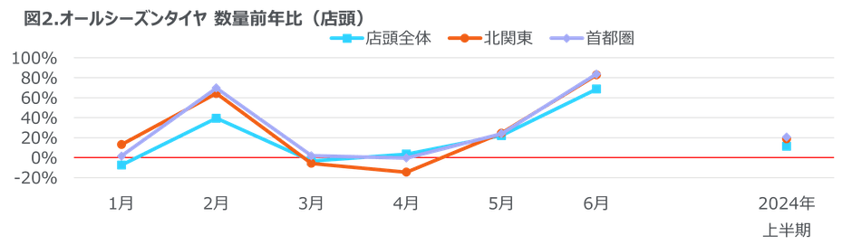 オールシーズンタイヤの2024年上半期の数量前年比は全体で34%減と大幅な減少となったが、店頭販売では同11%増と二桁成長を見せた(図2)。特に北関東と首都圏で販売が伸びており、数量前年比はそれぞれ19%増、21%増に至った。これは2月の降雪による影響が大きく、北関東、首都圏では前年同月の1.6倍を超える規模となった。