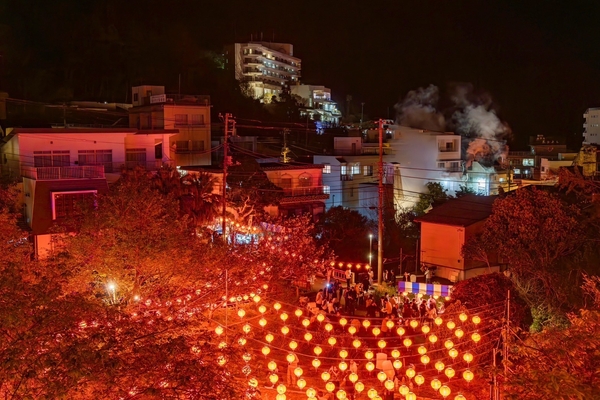 湯けむりの街に夕暮れが訪れると、温かな台湾提灯の灯りが一斉に浮かび上がる。