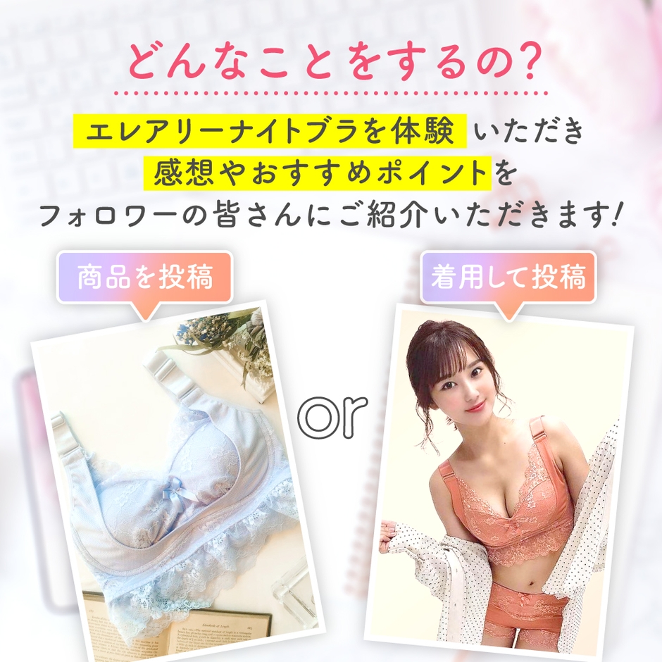 アンバサダーとしてエレアリーナイトブラのPRをお手伝いしてみませんか?エレアリーナイトブラを体験いただいてSNSで紹介するだけでOKです。