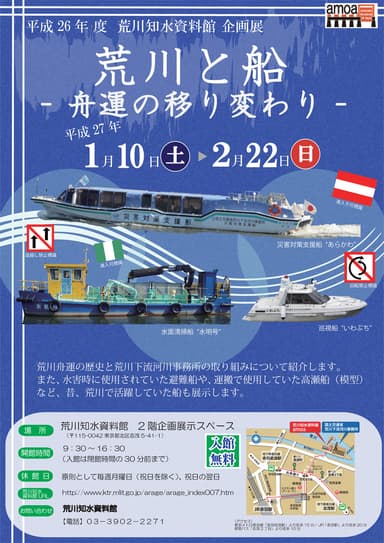 2015年1月9日 09:30荒川知水資料館(所在地:東京都北区、管理・運営:国土交通省 荒川下流河川事務所)では、2階・企画展示スペースにて企画展「荒川と船 - 舟運の移り変わり - 」を、2015年1月10日(土)より開催いたします。