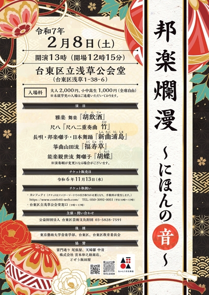 (公財)台東区芸術⽂化財団主催、『邦楽爛漫-にほんの<音>-』が2025年2月8日 (土)に浅草公会堂(東京都 台東区 浅草 1-38-6)にて開催されます。