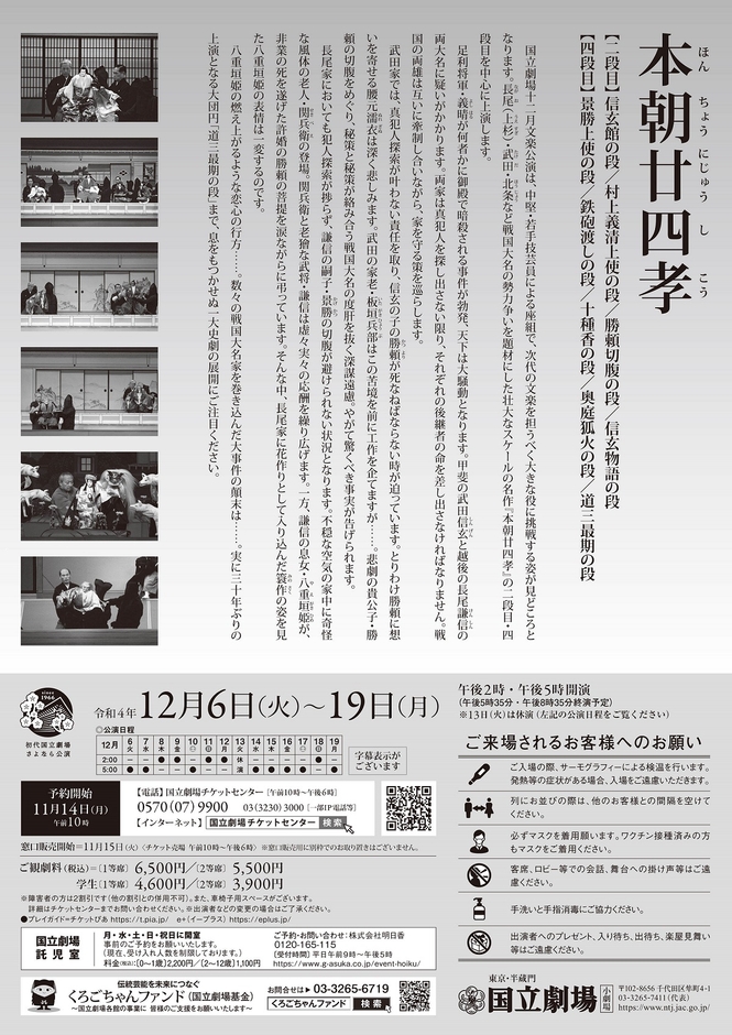 独立行政法人日本芸術文化振興会主催、「初代国立劇場さよなら公演」令和4年12月文楽公演『本朝廿四孝』が2022年12月6日 (火) ~2022年12月19日 (月)に国立劇場 小劇場(東京都千代田区隼町4-1)にて上演されます。
