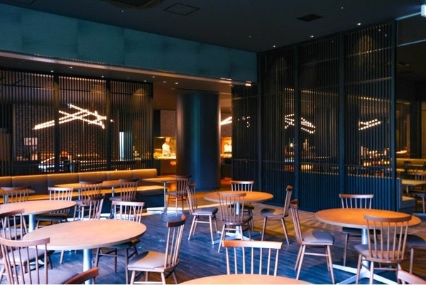 写真:黒を基調にしたスタイリッシュな空間。木目調のシンプルな椅子とテーブルがモダンな雰囲気を醸します。