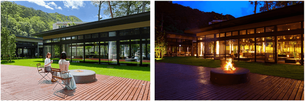 本物の薪をくべるファイヤーピットを中心に、日中はもちろん満天の星空を眺める夜もお客様が集う空間です。