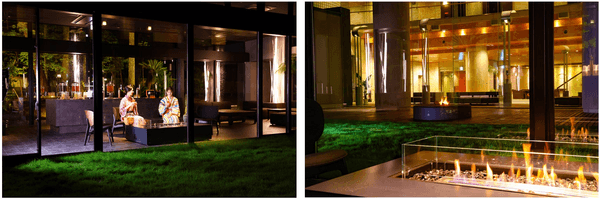 ロビーラウンジの大きなガラス窓の向こうに広がるコートヤード(中庭)。