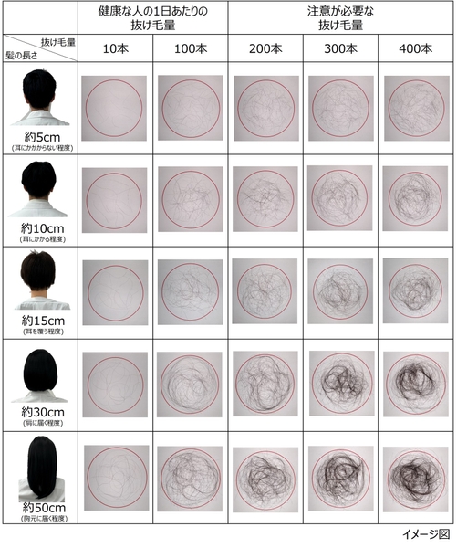 そこで、自分の抜け毛量をイメージしやすいように、髪の長さ別に1日の抜け毛量を可視化しました。その結果、同じ抜け毛本数であっても、髪の長さによって印象が大きく異なりました。