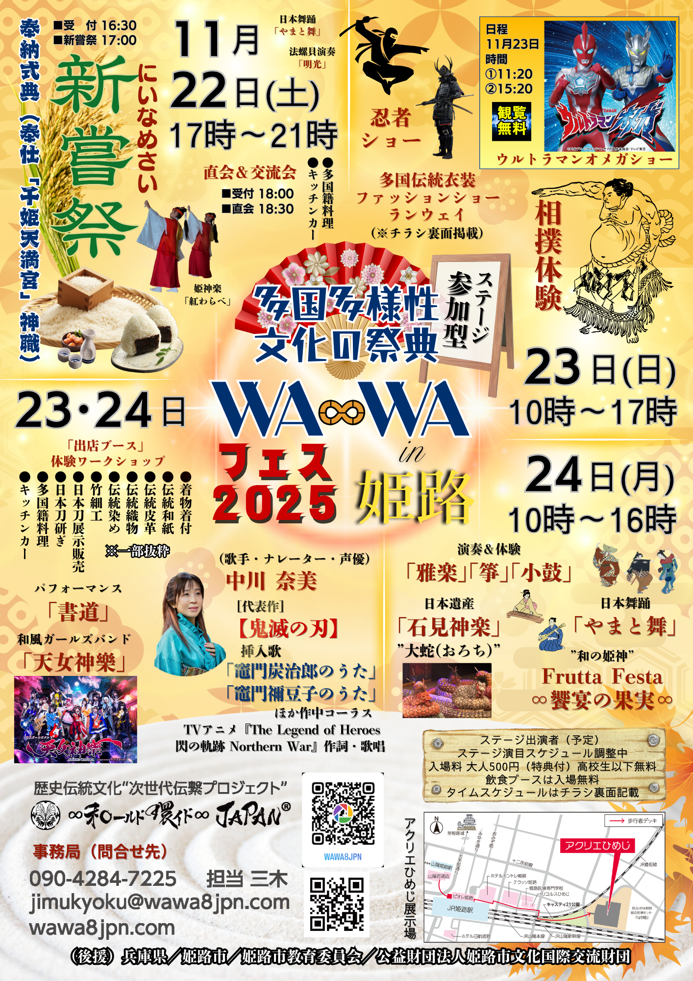 多国多様な伝統文化が一堂に会する「WA∞WA FESTIVAL2025 in 姫路」が、11月22日(土)から24日(月)までアクリエひめじにて開催されます。