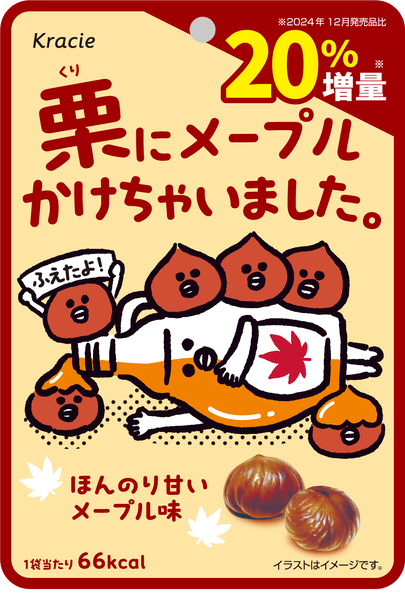 2024年に発売した「栗にメープルかけちゃいました。」は、若年層をターゲットに、スイーツのような甘さとキャラクター入りのパッケージで好評を得ました。「もっと多く食べたい」という声に応え、美味しさはそのままに20%増量して再発売いたします。1袋あたり66kcal、脂質0.5g、食物繊維2.1gで、罪悪感なく楽しめる間食としておすすめです。