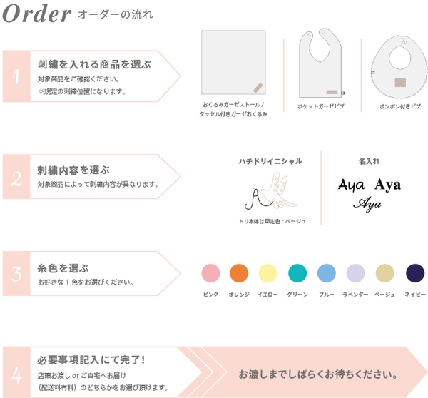 刺繍に対応可能な商品、刺繍内容、糸色をお選びいただきます。オンラインストア受付では配送のみ、店頭受付では配送及び店頭お渡しが可能です。