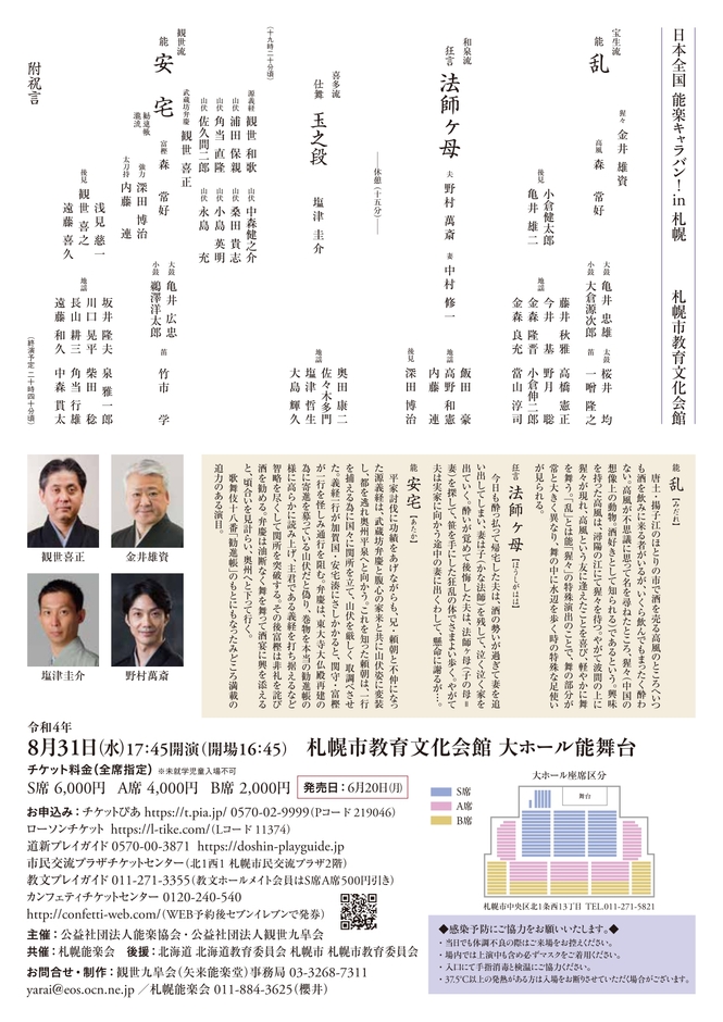 公益社団法人能楽協会・公益社団法人観世九皐会主催、『日本全国能楽キャラバン! in 札幌』が2022年8月31日 (水)に札幌市教育文化会館 大ホール(北海道札幌市)にて開催されます。チケットはカンフェティ(運営:ロングランプランニング株式会社、東京都新宿区、代表取締役:榑松 大剛)にて発売中です。