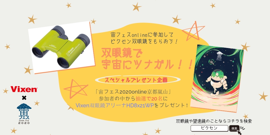 総合光学機器メーカー株式会社ビクセン(本社:埼玉県所沢市、代表取締役:新妻和重)は、「宙フェス2020 online 京都嵐山」の開催に協賛します。さらに、参加者の中から抽選で20名にビクセン双眼鏡が当たる、プレゼントキャンペーンを行います。
