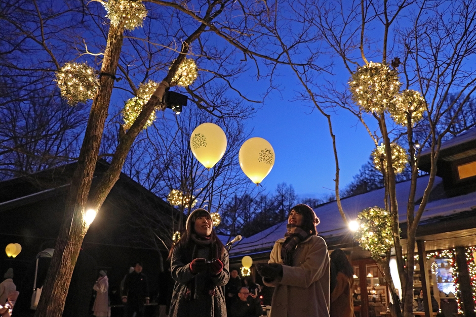 軽井沢の森に自生する「やどりぎ」をかたどった、球状のイルミネーションがハルニレテラスの木々にやさしく灯ります。やどりぎは、冬でも枯れることなく緑の葉を保つ植物です。このため西洋では「不死・不滅」の象徴とされており、クリスマスに欠かせない装飾の一つになっています。頭上に飾られたやどりぎの下を通ると、幸福が訪れるとも言われています。