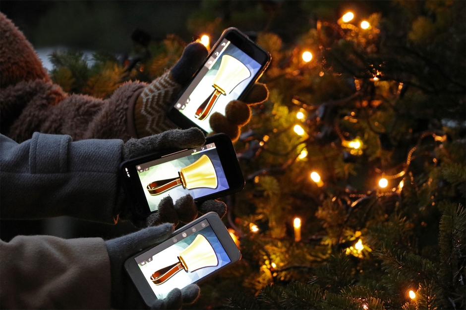 毎週土・日曜日と12月24日、25日にシンボルツリーに明かりを灯すクリスマスキャロリングを行います。お客様とスタッフが心を合わせてクリスマスソングを奏でるひとときです。合奏に用いるものは、スマートフォンを振るとハンドベルの音色が響くアプリケーションソフトです。参加者全員が呼吸を合わせて、本物のハンドベルを鳴らすようにスマートフォンを振ります。無事に1曲が奏でられたところでシンボルツリーが華やかに点灯します。なお、3密を回避するため定員は先着20組迄です。もみの木広場に20組分設置した、直径2メートルのキラキラと輝く光の輪に入って合奏することでソーシャルディスタンスを保ちつつ、クリスマスのワクワクする気持ちを分かち合うことができます。