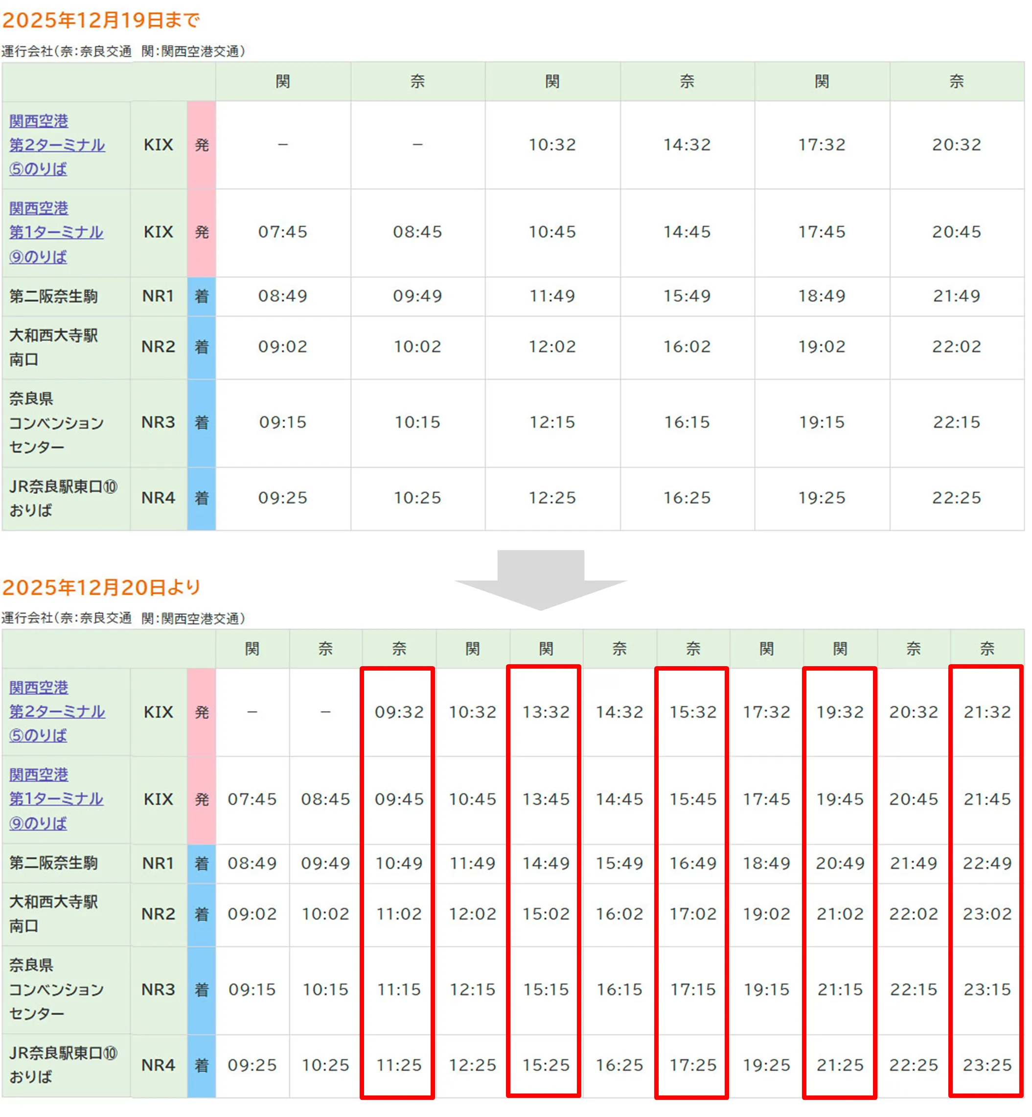 関西空港交通株式会社および奈良交通株式会社は、多くのお客様にご利用いただいている空港リムジンバス奈良関空線を、2025年12月20日より大幅に増便し、あわせて、最終便の発車時刻を繰り下げます。
