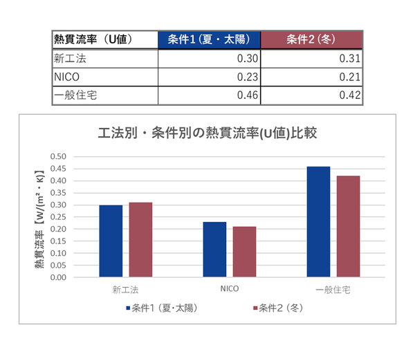本新工法は、サンコーホームの高断熱仕様(UA値0.25W/㎡k)商品『NICO(ニコ)』に次ぐ、優れた断熱性能(熱貫流率)を示すことが確認されました。これは、施工の簡略化やコスト削減を実現しつつも、期待を上回る性能結果でした。