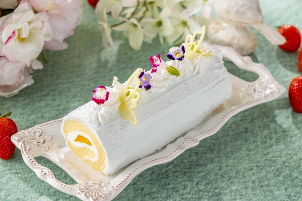 メロンの生クリームとメロンカスタードを巻き上げたロールケーキ。淡い色合いで、妖精の家をモチーフにしたファンタジックな世界観を表現しました。