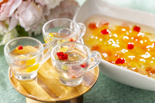 妖精の泉の幻想的な雰囲気をイメージしたゼリーボール。 苺、キウイ、黄桃の3種のフルーツで仕上げた、色鮮やかな一品です。