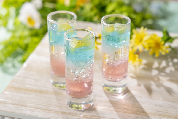 苺、レモン、ブルーハワイの3色が美しく重なる、神秘的なグラデーションゼリー。 中央のレモンゼリーにはナタデココを忍ばせ、トップにはりんごのコンポートを添えた、見た目も味わいも爽やかな一品です。