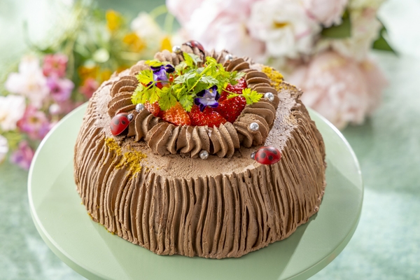 ふわふわの苺生地に苺クリームをまとわせ、たっぷりのベリーをあしらいました。ガーデンをイメージして緑色を添え、上品なデザインに仕上げました。