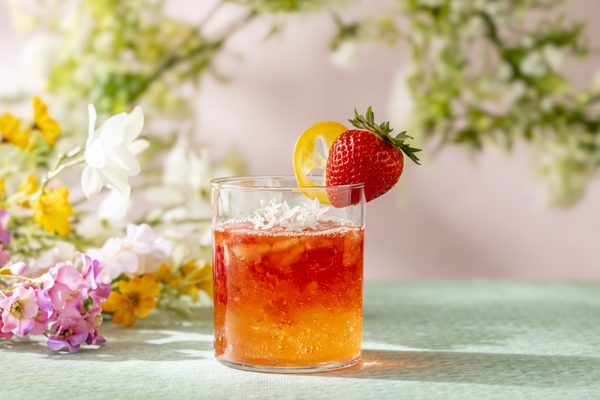 グラスの底に敷き詰めたのは、クラッシュしたローズと苺のゼリー。そこに潰した苺の果実とシロップを重ね、アセロラジュースを注いだ、爽やかな酸味が広がるドリンクです。口に広がる苺の果肉の食感もお楽しみいただけるよう、潰した状態でご用意しました。トップには、純白のエディブルフラワーをあしらい、妖精の魔法の粉をイメージした銀粉をふんわりと。さらに苺とドライレモンを飾り、見た目にも華やかな一杯に仕上げました。春の訪れを感じさせる、可憐で幻想的なドリンクをぜひご堪能ください。