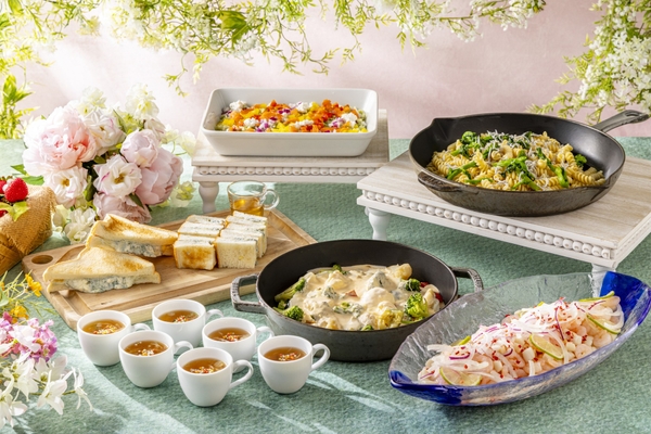 約15種類のセイボリーには、春の訪れを感じさせる魅力的なラインナップをご用意しています。 お口直しにぴったりな、さっぱりとした苺風味の「ドライストロベリーとシーフードのセビーチェ」、チェダーチーズとともに味わう「季節野菜のラクレット風」、ほのかにガーリックが香る「菜の花とシラスのパスタ」など、季節感あふれるメニューをお楽しみいただけます。 そのほかにも、あさりとカラフルなあられを添えた「海鮮中華スープ カラフルあられ添え」、お好みではちみつをかけて楽しむ「ゴルゴンゾーラのホットサンド はちみつ添え」、箱庭のような見た目が可愛らしい「スモークサーモンとカッテージチーズの箱庭風抹茶ちらし寿司」など、多彩なセイボリーをお好きなだけお召し上がりください。