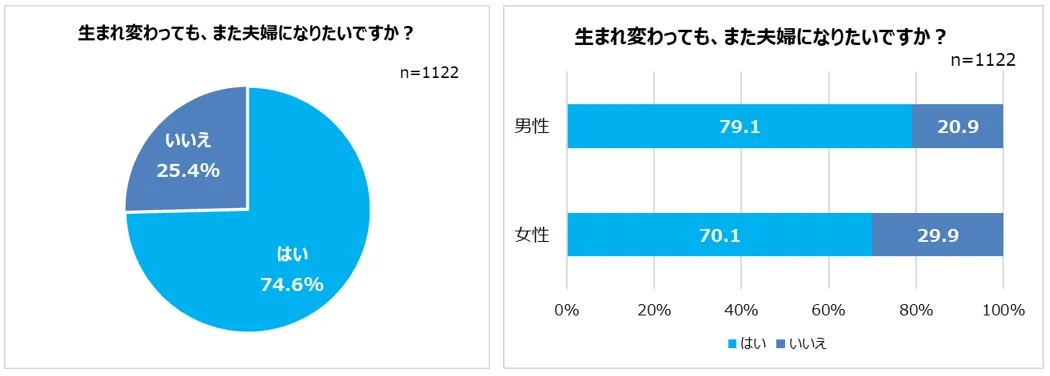 続いて、生まれ変わってもまた夫婦になりたいかを調べると、全体の7割以上が「はい(74.6%)」と回答。男女別にみると、「はい」と回答した人は、男性は79.1%、女性は70.1%と、男性が女性よりも9%高い結果に。しかし、逆に言えば男性の約2割、女性の約3割は「また夫婦になりたくない」と考えていることも明らかになりました。