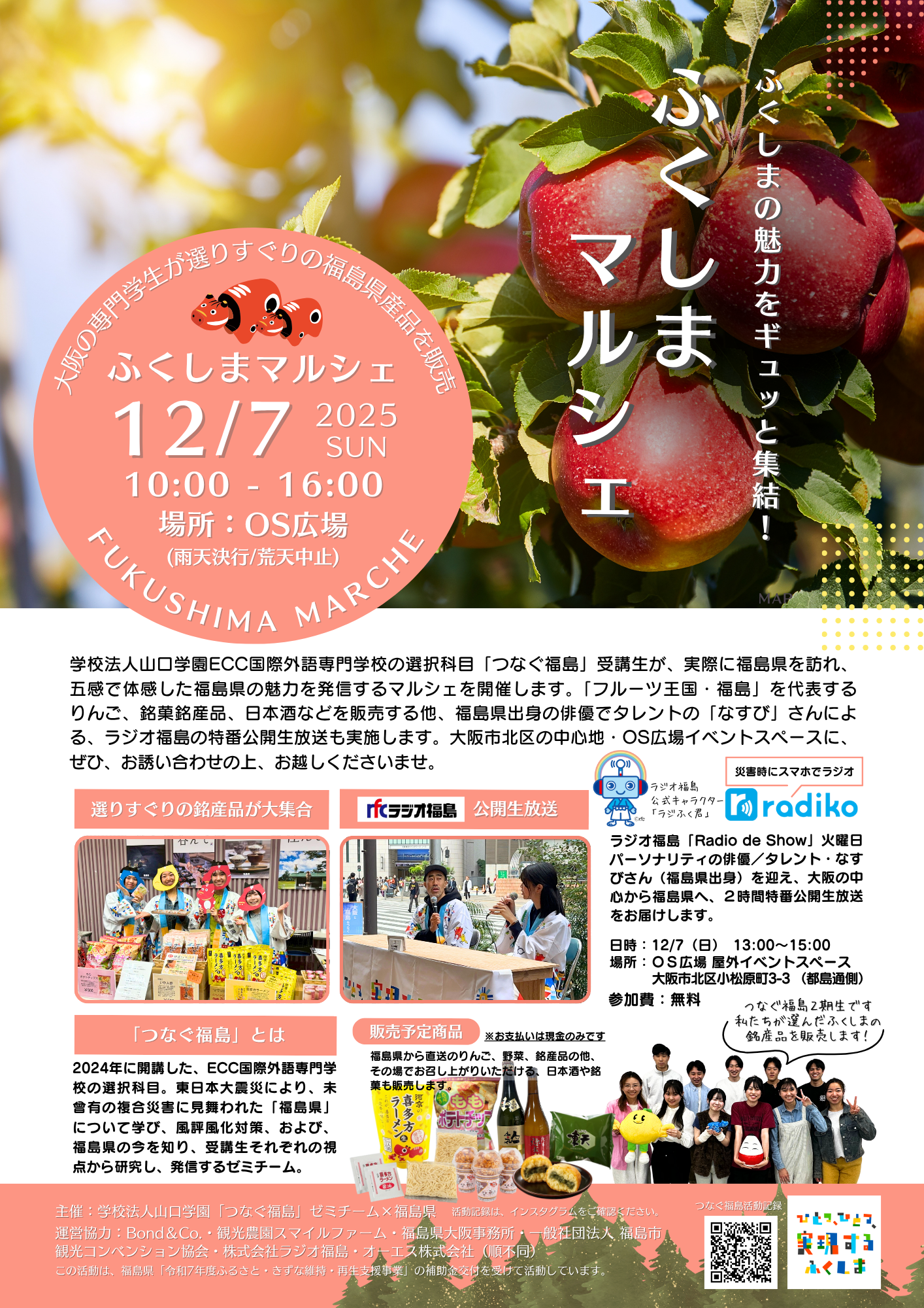 学校法人山口学園ECC国際外語専門学校(大阪市北区 学校長:大谷内 圭)の選択教科「つなぐ福島」受講生が、福島県の魅力を発信する福島銘産品市「ふくしまマルシェ」を、2025年12月7日(日)に開催します。福島県産の新米、野菜、「フルーツ王国・福島」を代表するりんごをはじめ、復興の花「アンスリウム」の生花、そして銘菓などなど!また、福島県出身のタレント「なすび」さんによる、ラジオ福島公開生放送も実施。大阪市北区の中心地・OS広場イベントスペースに、学生の「ふくしま愛」が広がります。