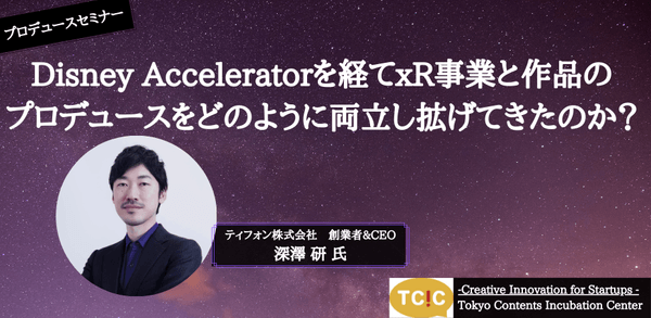 今回のテーマは『事業と作品(コンテンツ)のプロデュース』。Disney Acceleratorに1期生として参加し、資金調達にも成功した、ティフォン株式会社 創業者/CEOの深澤研氏を迎え、xRという市場がまだできていない頃からxR事業を始め、作品プロデュースまでを行ってきた実体験やノウハウを紹介していただきます。