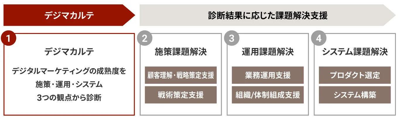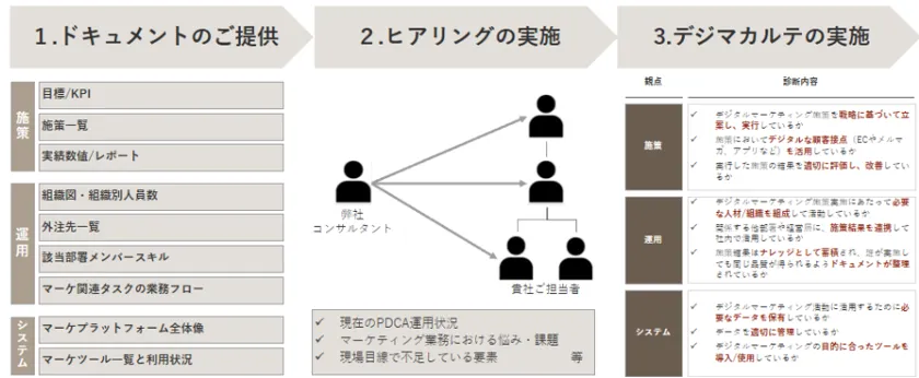 本サービスは、企業のデジタルマーケティングの現状を1~2か月程度の期間で診断します。