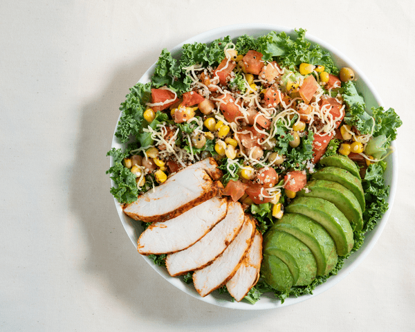 ケイジャンスパイスを効かせ香ばしくグリルしたチキンに、クリーミーなアボカドを豪快にトッピング。スーパーフードとして人気のキヌアを加え、香ばしく炙ったトウモロコシ、トマト、ケール、レタス、チーズなど、色鮮やかな食材をバランス良く組み合わせました。コク深くスパイシーなメキシカン風ドレッシングが全体の味わいをまとめ、食べ応え満点です。
