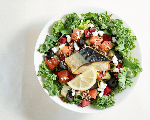 オメガ3(n-3)脂肪酸が豊富なサバのハーブマリネを主役に、ビーツ、トマト、オリーブ、カッテージチーズを合わせた爽やかな色合いの一品です。レモンの酸味とハーブの香りが広がる自家製シトラスビネガードレッシングでさっぱりとした仕上がりとなっており、地中海風の味わいを楽しめます。