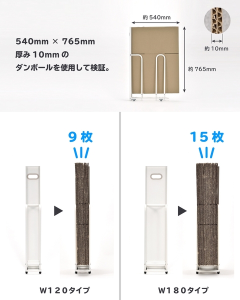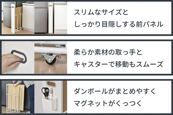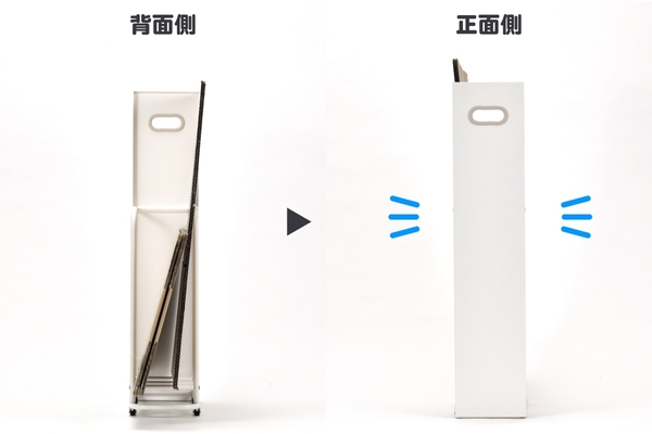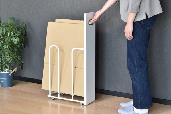 filleteダンボールストッカーなら、ダンボールをスリムにまとめることができ、前面の目隠しパネルで見た目もスッキリ!