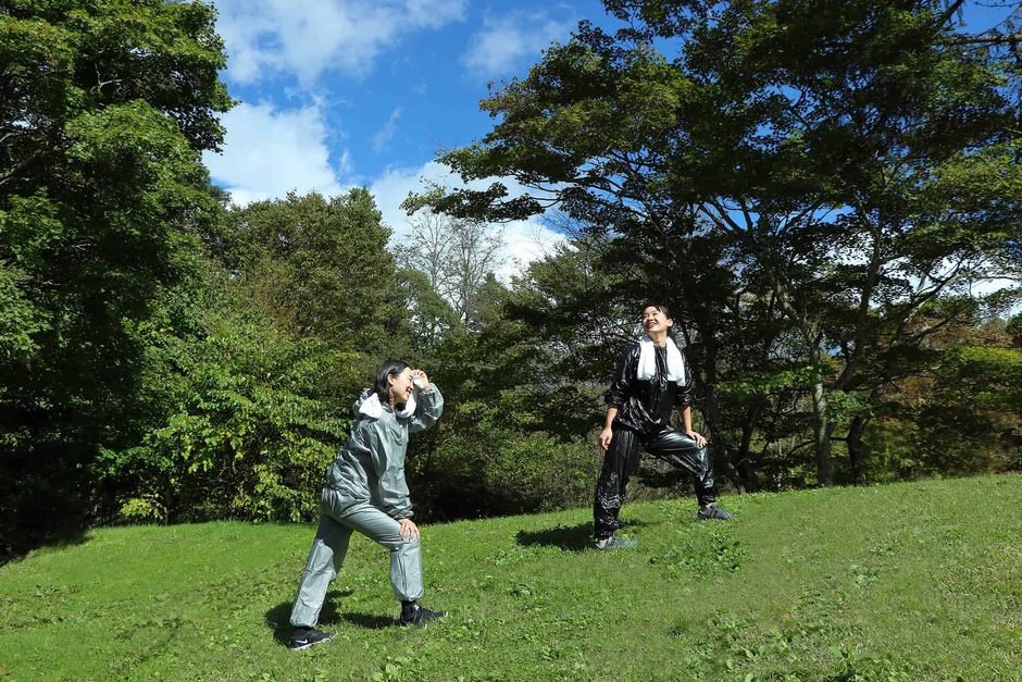 当ホテルが位置する軽井沢星野エリアには、大きな広場や勾配約15~20%の坂があります。大きな広場で長距離を走るもよし、坂で猛ダッシュするのもよし、好みの場所で走って汗をかくことができます。より一層汗をかくことができるようサウナスーツの無料貸し出しや、水分補給のための「軽井沢野鳥の森」を水源とした飲料水10リットルをホテル到着時にお渡しします。