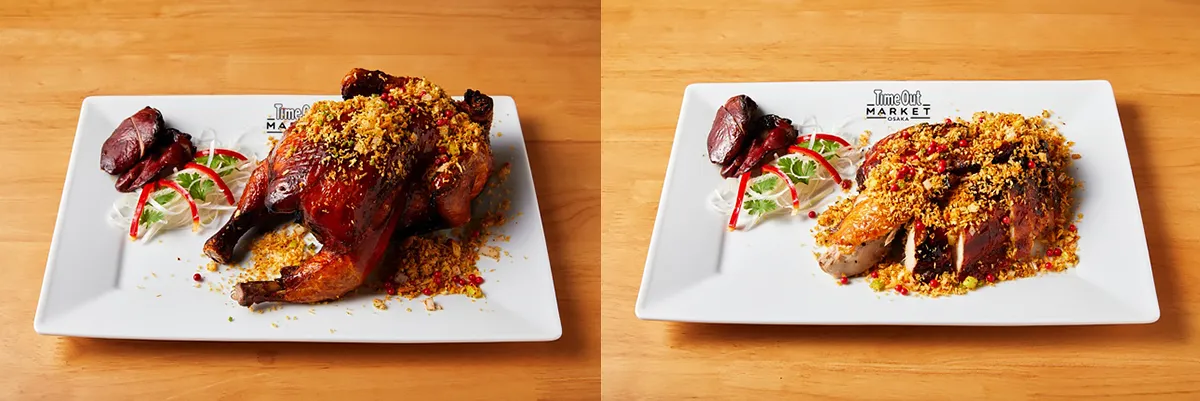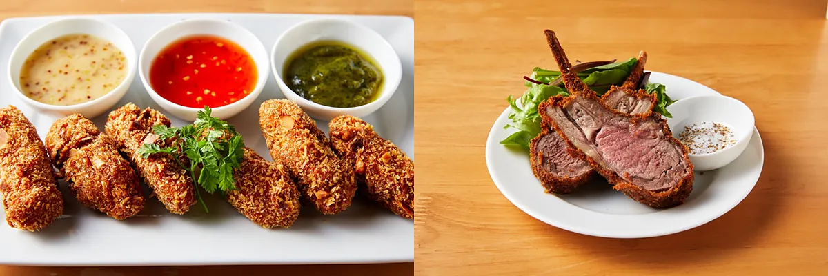 皮がカリカリになるまで揚げ焼きにした若鶏に、スパイスを効かせた香り高いパン粉をまとわせました。濃厚な味わいの、鶏レバーのチャーシューを添えて。