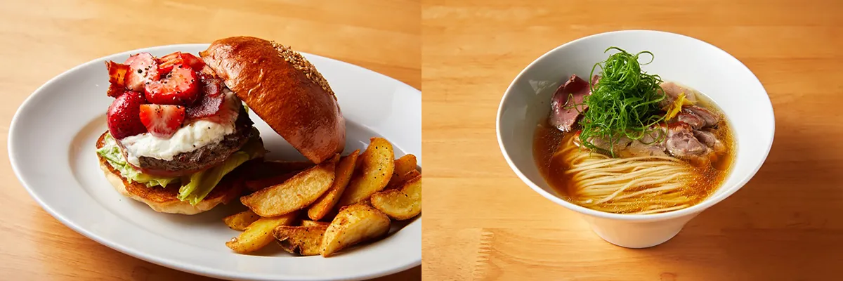 自家製バンズにジューシーなパティとカリカリベーコンをのせ、バルサミコでマリネしたいちごとサワークリームを重ねました。甘じょっぱさがクセになる冬だけの味。
