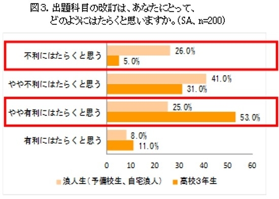 ■出題範囲改訂について、現役生は「有利にはたらく」、浪人生は「不利にはたらく」と回答。