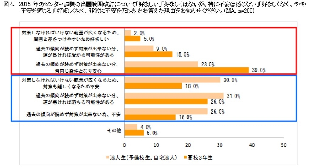 また、出題範囲改訂について、浪人生は「過去の傾向が読めず対策が出来ない為、不安」「過去の傾向が読めず対策が出来ない分、運が悪ければ落ちる可能性がある」「対策しなければいけない範囲が広くなり、対策も難しくなるため不安」など、ネガティブな回答が多く、現役生は「過去の傾向が読めず対策が出来ない分、皆同じ条件となり安心」「過去の傾向が読めず対策が出来ない分、運が良ければ受かる可能性がある」「対策しなければいけない範囲が広くなるため、周囲と差をつけやすいため好ましい」など、ポジティブな回答が多い結果になりました(図4)。