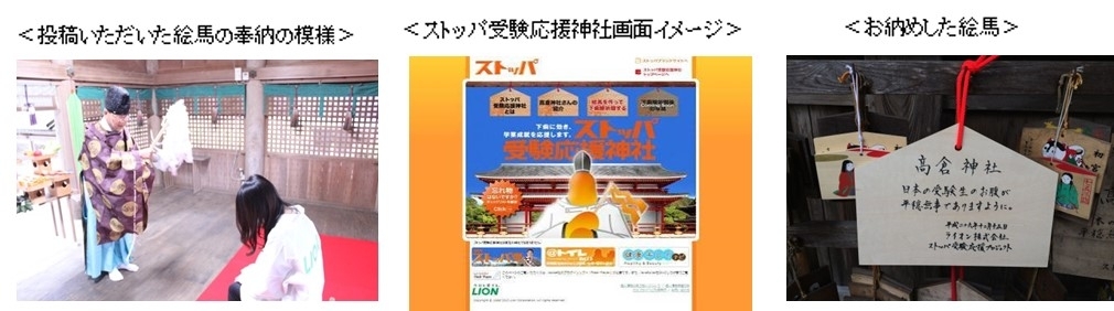 『ストッパ』ブランドサイト内に期間限定で開設しているコンテンツ「ストッパ受験応援神社」では、Web画面から“下痢除(よけ)祈願”の絵馬に願いを投稿(入力)することができます。投稿頂いた絵馬は、2014年12月15日(月)にお腹の神様を祀る京都府綾部市高倉神社に納めました。今後、2015年3月までの間に2回、納める予定です。